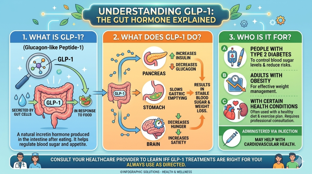 GLP-1 is a hormone that is naturally produced in the small intestine when you eat. It helps tell your pancreas to release insulin, which brings down blood sugar. It also signals your stomach to slow down, so you feel fuller longer and don’t become hungry as quickly after eating. This combination makes GLP-1 really important for controlling blood sugar and managing hunger.
