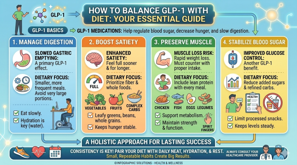 GLP-1 medications can be very helpful for people with type 2 diabetes or obesity, but it’s always best to understand that drugs work even better when combined with other healthy habits. Eating a balanced diet and moving your body regularly help the medication do its job. When you stick to good nutrition and exercise routines, the benefits of GLP-1 become more obvious, and you’re less likely to rely on medication alone.