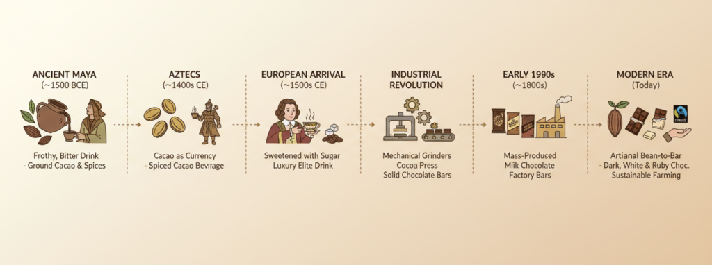 When cacao made its way to Europe in the 1500s, sugar was introduced to the party and things quickly exploded—hot chocolate, truffles, fondue fountains at awkward weddings, and even chocolate-covered fruit. Chocolate became the universal love language of comfort and celebration, with chocolate transforming into a treat closer to what we have today, quickly becoming a symbol of wealth, celebration, and gratification.